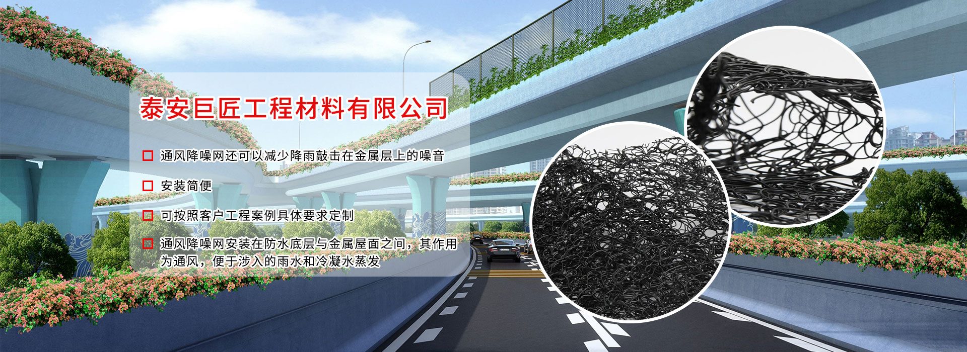 • 通風降噪網,鋼塑土工格柵、防滲膜、土工布、土工格室、三維土工網墊、軟式透水管、塑料盲溝、土工席墊、排水板、三維植被網等